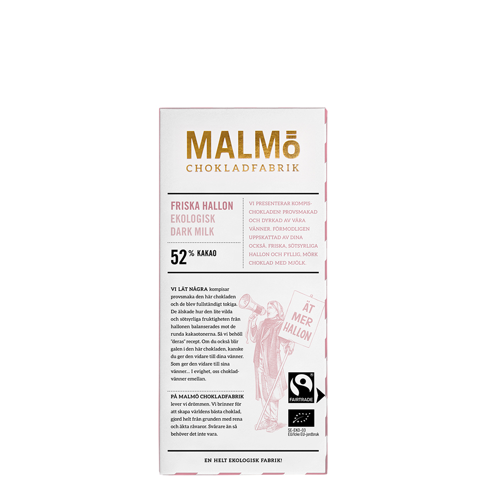 Vi presenterar kompischokladen! Provsmakad och dyrkad av våra vänner. Förmodligen uppskattad av dina också. Friska, sötsyrliga hallon och fyllig, mörk choklad med mjölk.