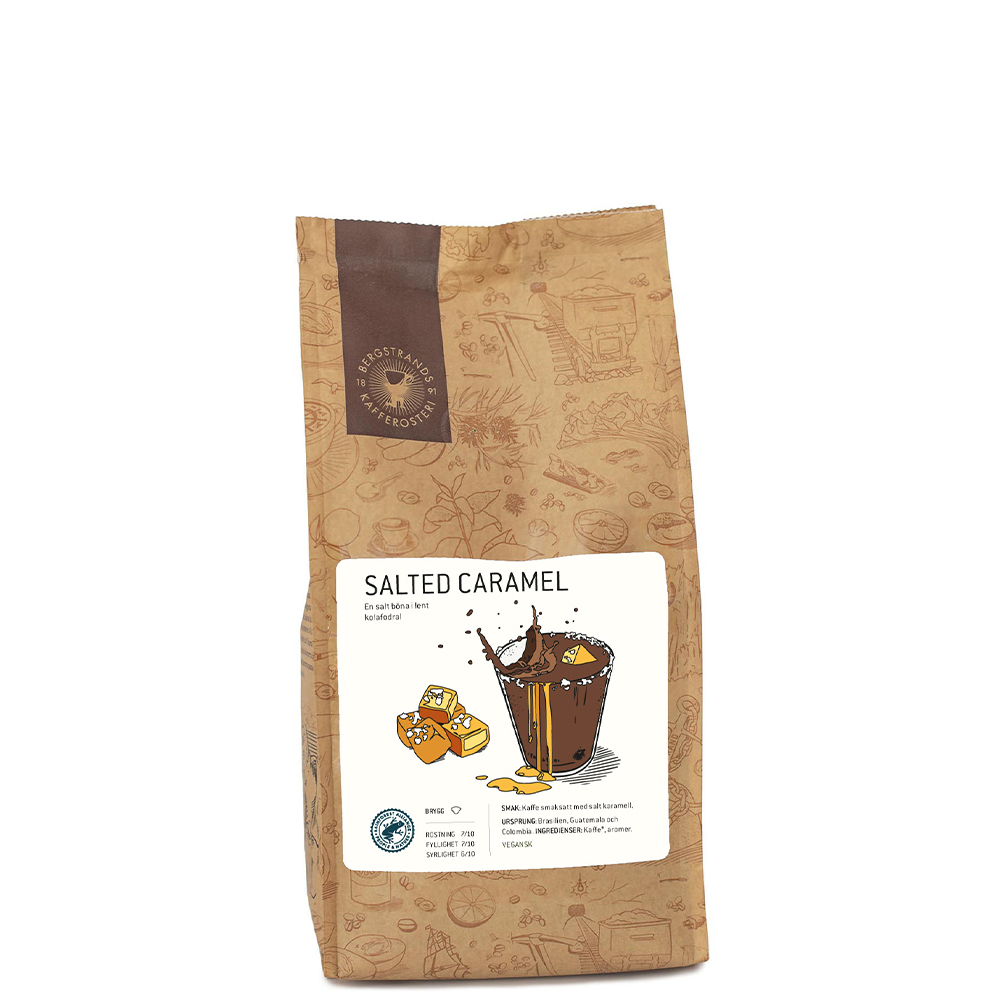 Detta smaksatta kaffe är en härlig kombination av svensk kaffetradition och Bergstrands förkärlek till goda likörer. Salted Caramel är en modern kombination av sött och salt – två fantastiska smaker förenade i en och samma kopp. Detta kaffe passar perfekt till den italienska kaffedesserten Affogato!