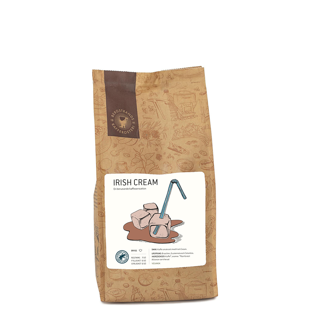 Detta smaksatta kaffe är en härlig kombination av svensk kaffetradition och Bergstrands förkärlek till goda likörer. Här framhävs kaffebönans aromer av den läckert söta likören. Irish Cream består nämligen av den klassiska kombinationen kaffe och Baileys berömda likör. Detta kaffe passar perfekt efter maten, kanske med en klick vispgrädde på toppen?
