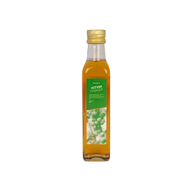 Vinäger framställd på vitt vin med en syrahalt på 7%. Tillverkad med helt naturliga metoder under medelhavets värmande sol. Passar perfekt i dressingar ihop med olivolja och lite örter.