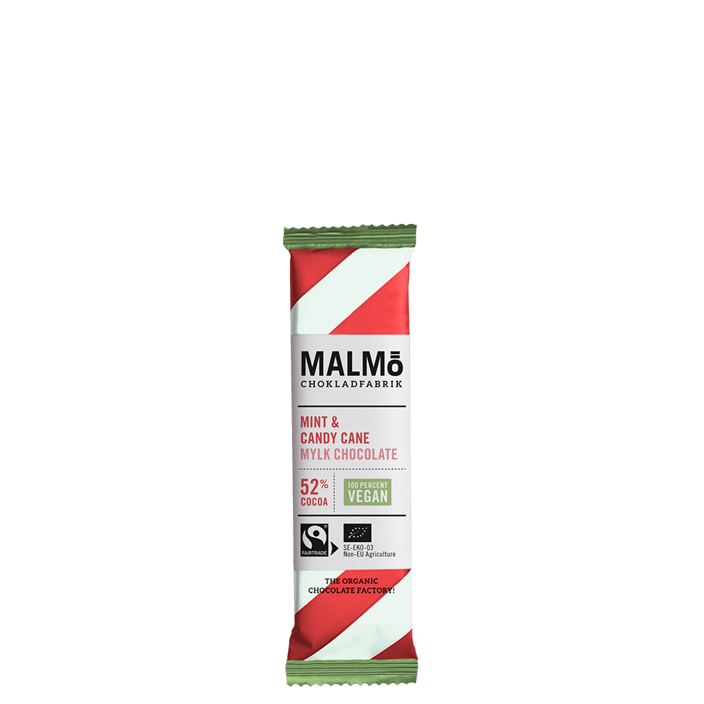 En klassisk ljus choklad med en smak av frisk polkagris och mint. Gjord på mylk och därmed vegansk. Chokladen är ekologisk, vegansk och fairtrade, samt fri från nötter, soja och är glutenfri.