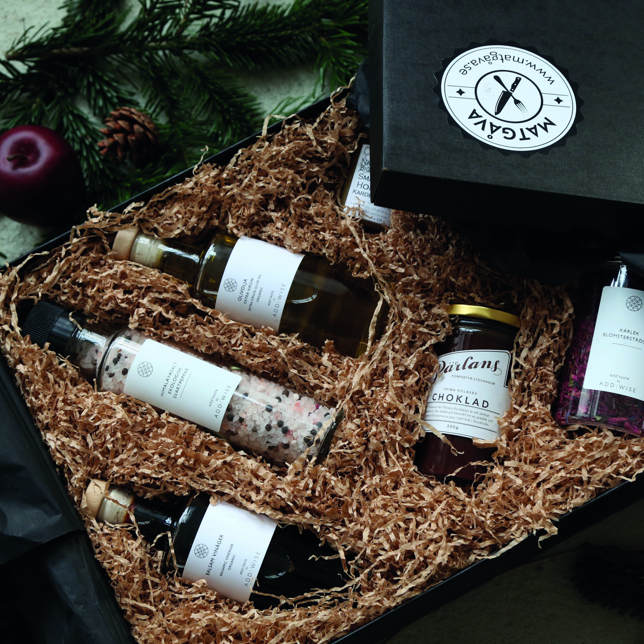 Alla våra matgåvor som ni finner nedan består av högkvalitativa produkter. Vidare levereras även denna fina julklapp i en svensktillverkad och miljövänlig box.
