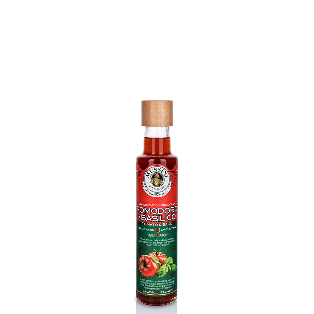 TOMAT och BASILIKA, en del av den nya serien Balsamic R-Evolution, är en fruktig sötsyrlig smaksättare som förenar traditionen hos de finaste druvmusterna, använda i tillverkningen av balsamvinäger, med en nyskapande twist – tack vare de ikoniska smakerna från det italienska köket.