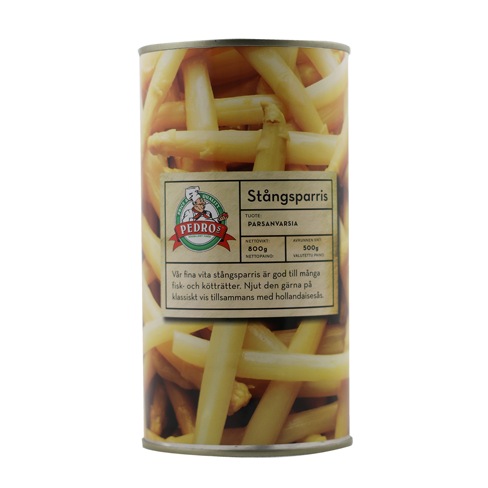 - Vit sparris (62,5%), vatten, salt, citronsyra (E330).
