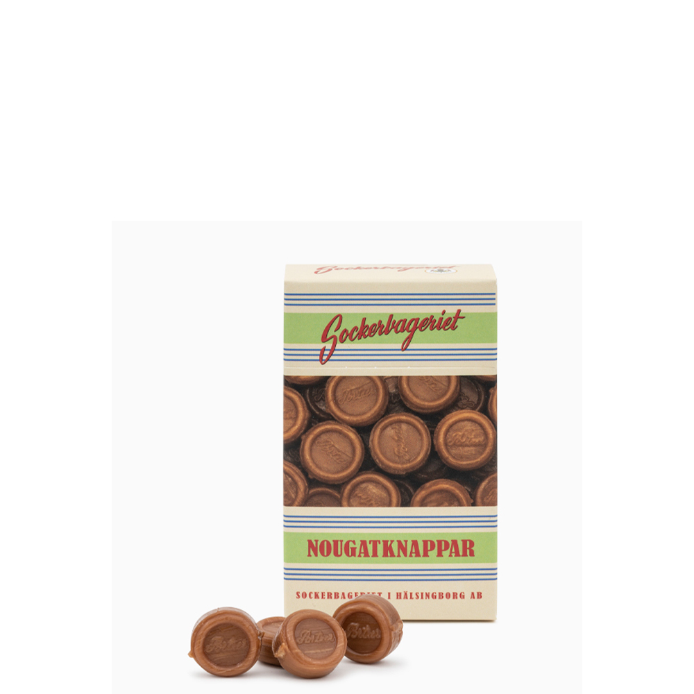 Nougatknappar – Klassiska nougatknappar med ett knaprigt yttre med mjuk hasselnötsfyllning. En ask nostalgi helt enkelt!