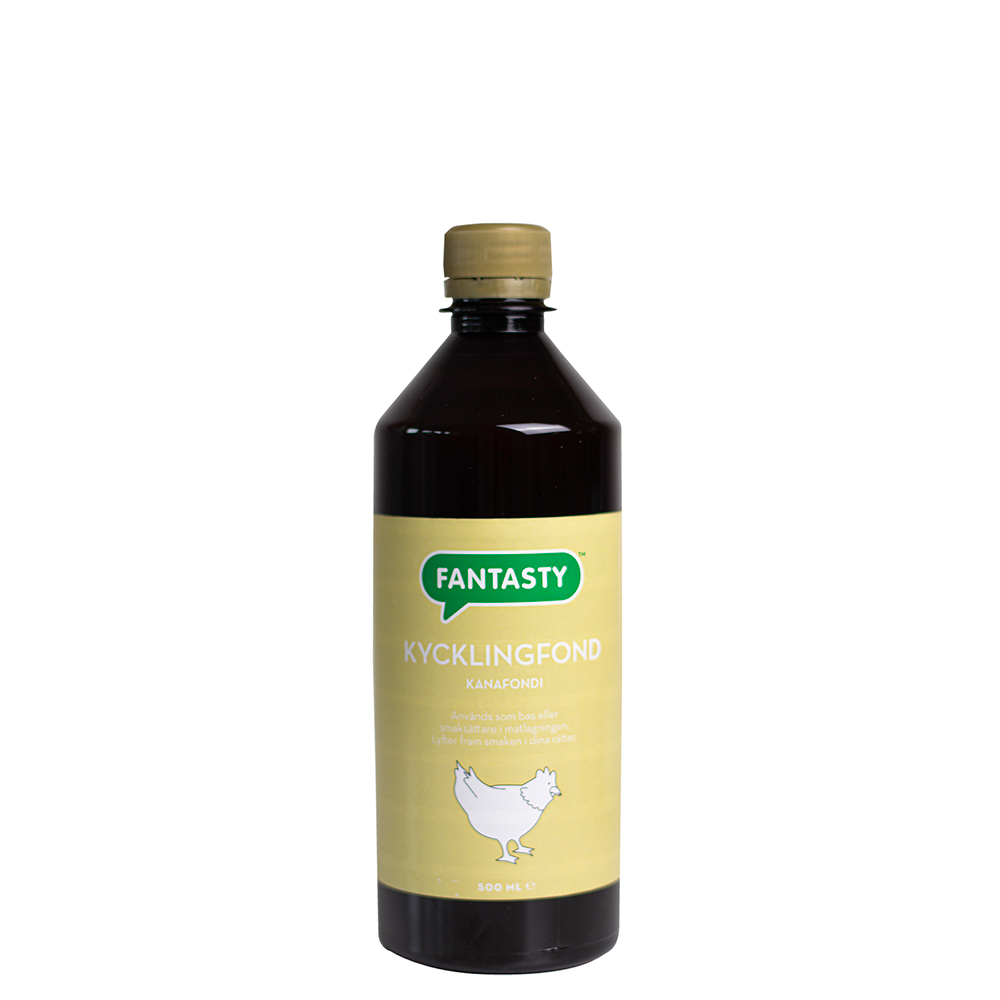 - Vatten, salt, smakförstärkare (E621, E631), jästextrakt, smakämnen, modifierad stärkelse, kycklingkött (1%), socker, syra (citronsyra), gurkmeja, förtjockningsmedel (E412,E415), konserveringsmedel (E202), karamelliserat socker. Salthalt i färdig fond 0,7%.