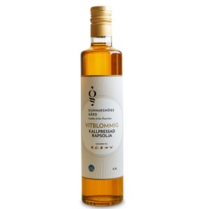 Vi tillverkar vår vitblommiga rapsolja av rapsfrö odlat på vår egen gård. Kallpressningen ger oss en naturligt gyllengul färg på oljan och med en mild nötig smak, vi kallar den guldet från Österlen. Vår vitblommiga rapsolja passar bra till vit fisk, färsk sparris och i  söta bakverk.