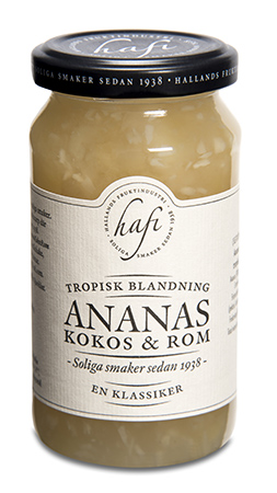 Detta är Hafis tropiska blandning av ananas, kokos och rom. Sylten är god som tårtfyllning, i milkshake, till kycklingrätter och i asiatisk mat.