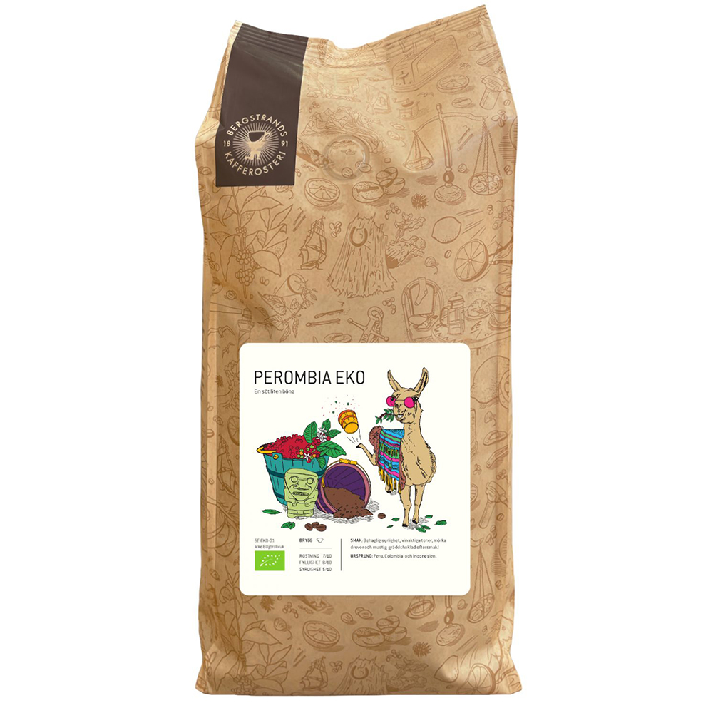 Perombia är en ekologisk favorit med tydliga karaktäristiska drag från dess ursprungsländer. Blandningen har en bas på bönor från södra delen av Colombia i Huila distriktet med tydlig fruktig syra, vindruvor och plommon. Bönderna har länge fokuserat på ekologisk odling och har som mål att bli ledande exportör av ekologiskt kaffe i Huila. Bönorna fån Colombia stärks av bönor från Peru. Peru är känt för sina högkvalitativa kaffe. Odlingarna ligger även dom på Andernas sluttningar där jordmånen är optimal. Bönorna från Peru har söta och runda drag av krispigt äpple, körsbär och ananas. Perombia passar perfekt i en kombination av söta smaker. Avnjut en kopp tillsammans med en nötmaräng, creme brulee eller en nougatglass. Toppen i koppen!