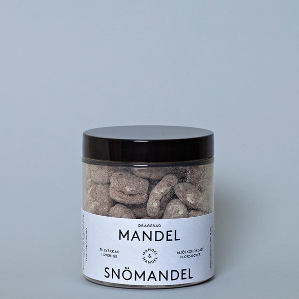 Svensktillverkade dragerade mandlar i mjölkchoklad och florsocker. Perfekt till en kopp kaffe!
