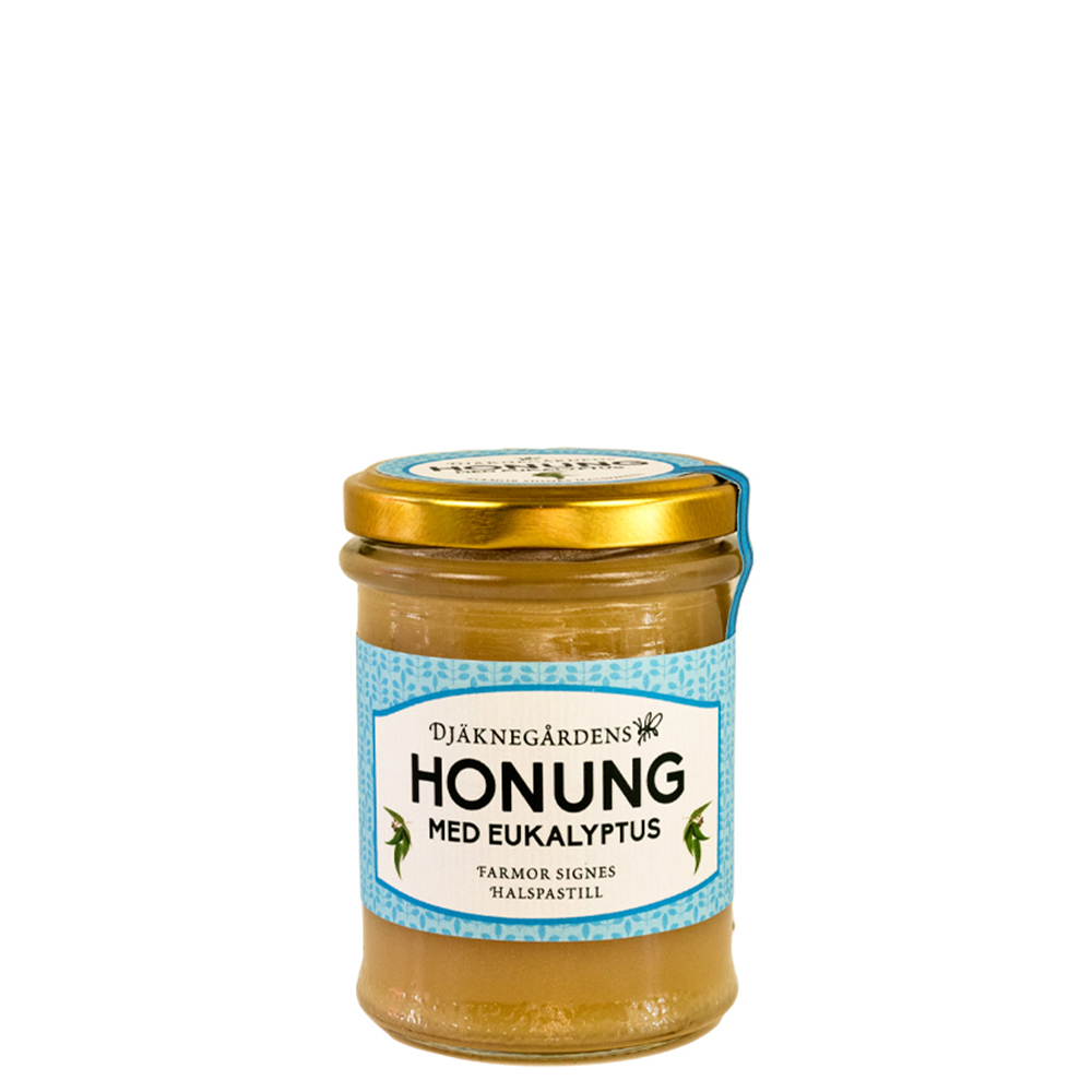 Denna honung smaksatt med eukalyptus blandas med fördel i lite ljummet vatten eller mjölk och dricks vid hostiga nätter eller när näsan rinner. En lenande husmorskur mot snuva och hosta!