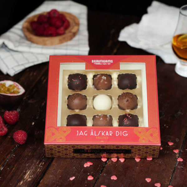 9st handgjorda chokladpraliner i lyxig chokladask, perfekt present att ge bort till den älsakde. Pralinaskarna från oss innehåller en fin mix av mörka, ljusa och vita handgjorda praliner. Till smaksättning använder vi bara naturliga råvaror, bla frukt, bär och likörer.