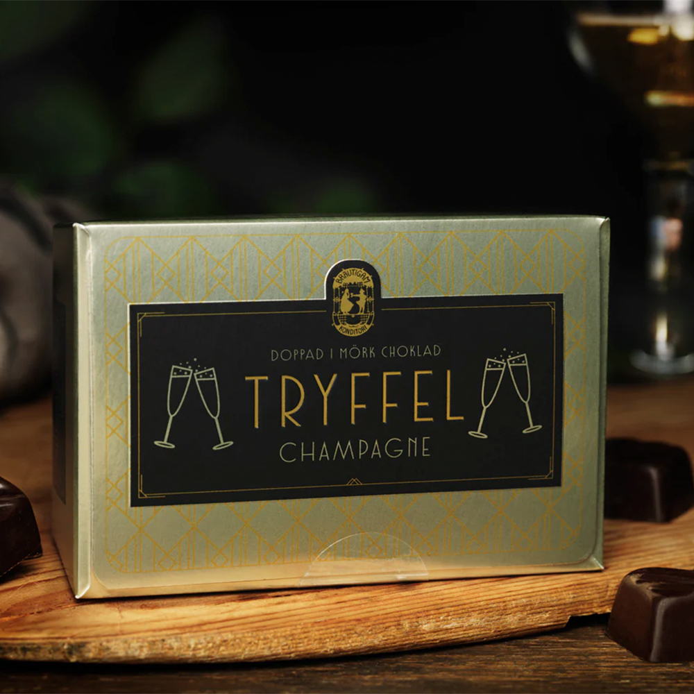 - Mörk choklad minst 70% kakao, (kakaomassa, socker, kakaosmör, SOJALECITIN, naturlig vaniljarom), ljus choklad minst 36,5% kakao, (socker, kakaomassa, MJÖLKPULVER, kakaosmör, SOJALECITIN, naturlig vaniljarom), GRÄDDE, glykossirap, SMÖR, Marc de Champagne 35%, alkohol.