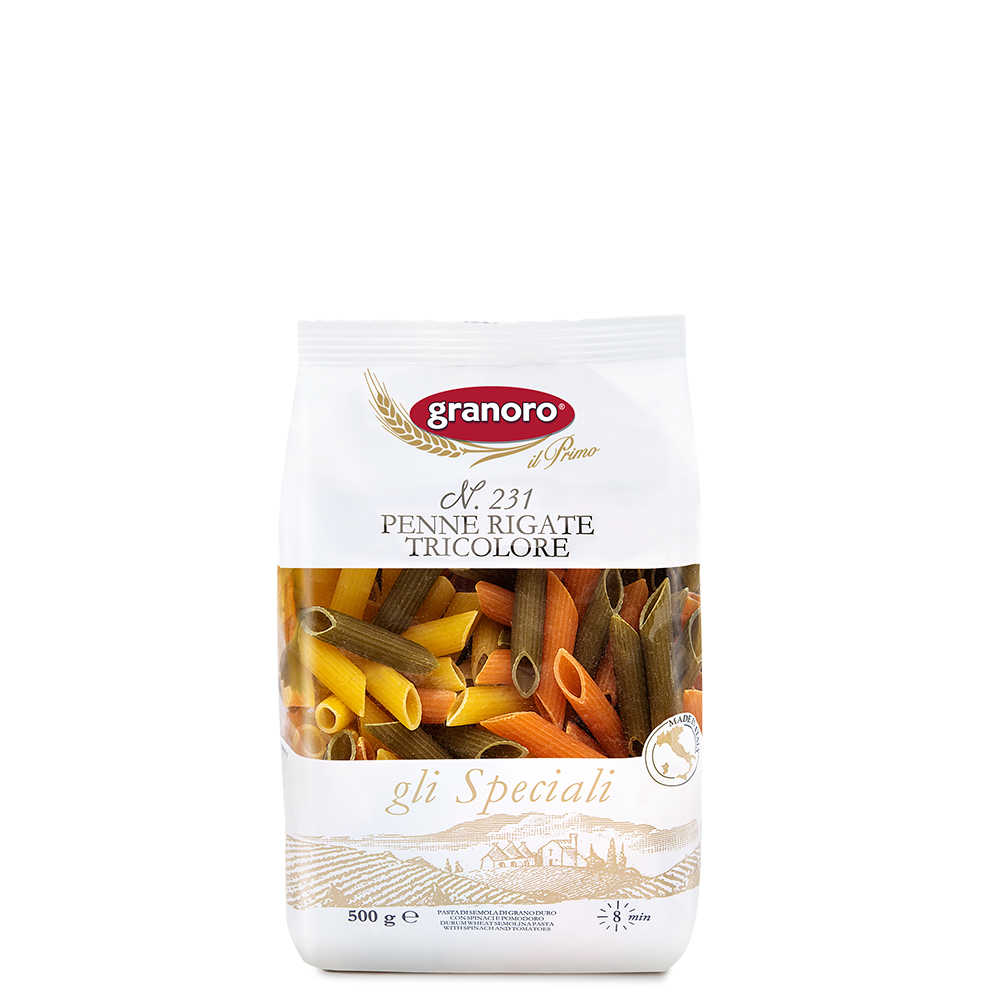Pata penne rigate tricolore gjord på durumvete semolina. Passar till exempelvis Carbonara, Bolognese eller Pesto.