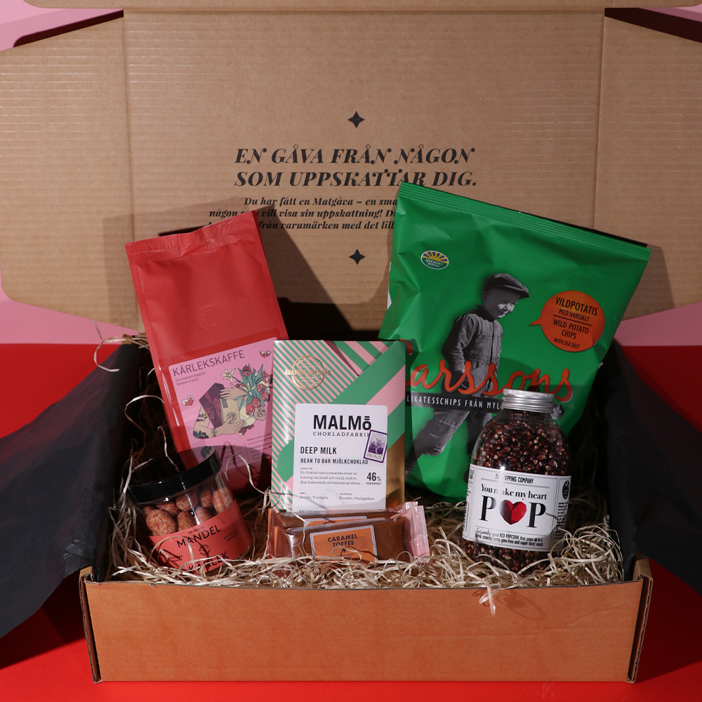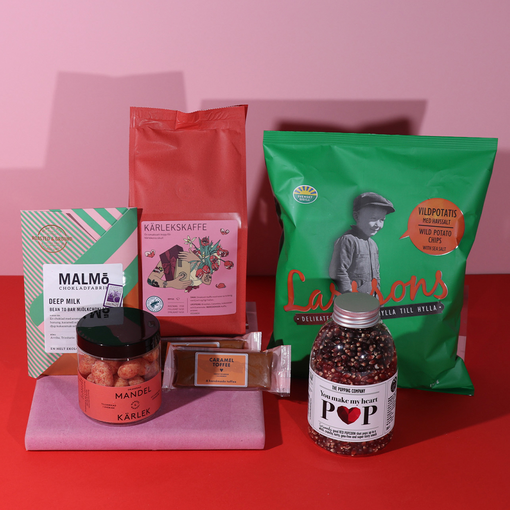 En låda full av kärlek är en kärleksgåva till någon du tycker om. Popcorn, chips och Ekologisk choklad lägger grunden för en smakupplevelse som toppas med ren kärlek. Kärlekskaffe från Bergstrands och mandlar från Mandel Mandel som avrundas med caramel toffe x 2.