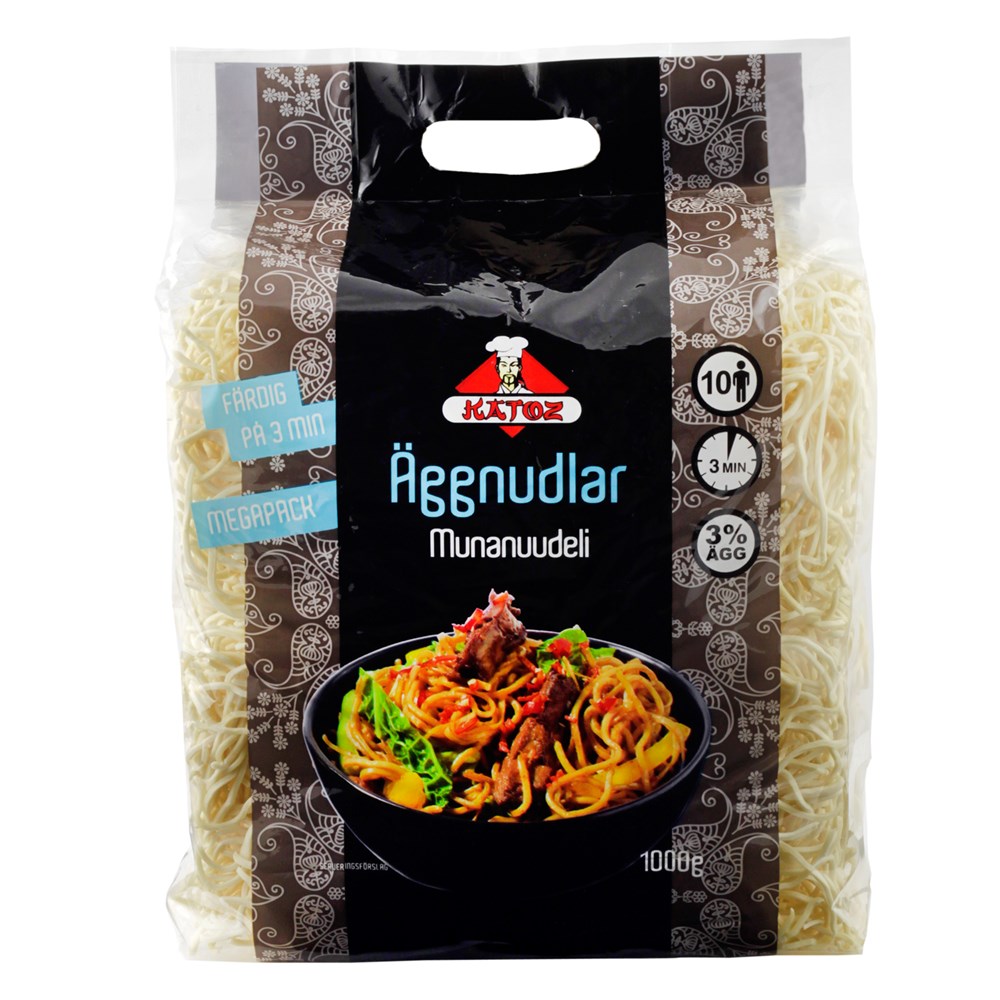 Äggnudlar används i exempelvis wokrätter och nudelsoppa. Förpackningen innehåller 16 portionsnystan.