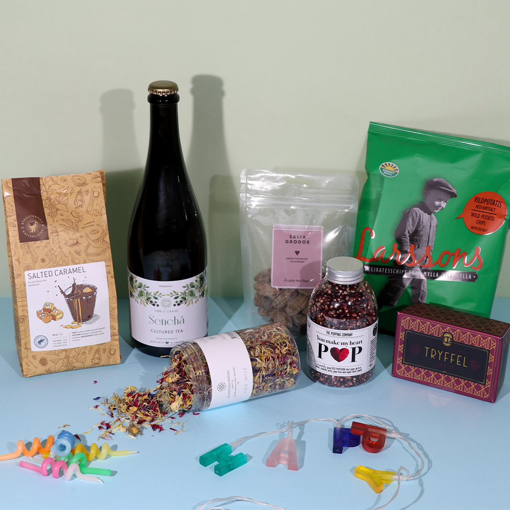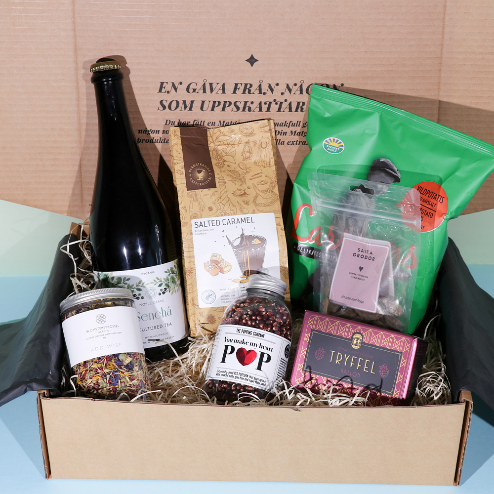 Skäm bort någon du tycker om med Matgåvan "Grattis" fylld av en härlig blandning av go mathantverk, och till stor del svenskproducerade, snacks favoriter! Goe kaffe, Mousserande te och Larssons chips är några av godsakerna i Matgåvan Grattis.