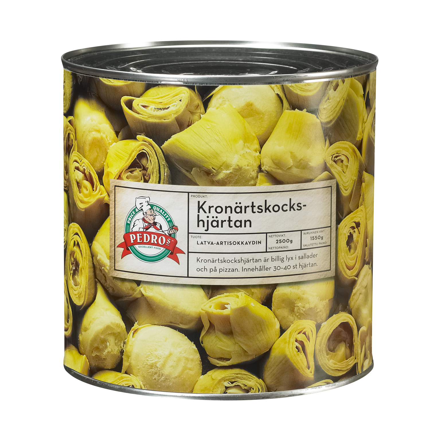 Kronärtskockshjärtan (62%), vatten, salt, antioxidationsmedel (citronsyra).