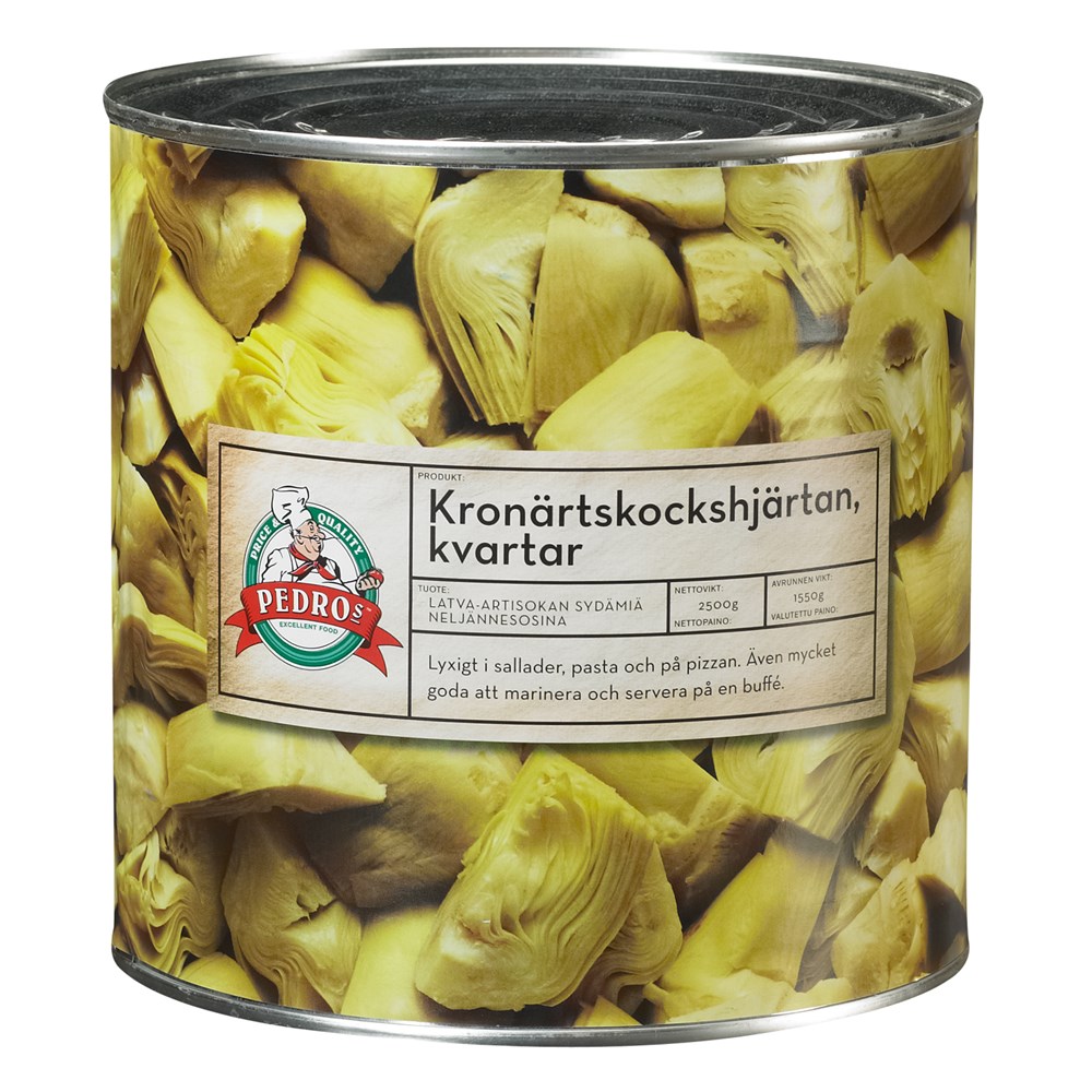 Kronhjärtan skurna i kvartar. Lyxar till sallader och är gott på pizzan eller i gratängen. Smidigare och enklare kan det inte bli! Mycket goda att marinera!