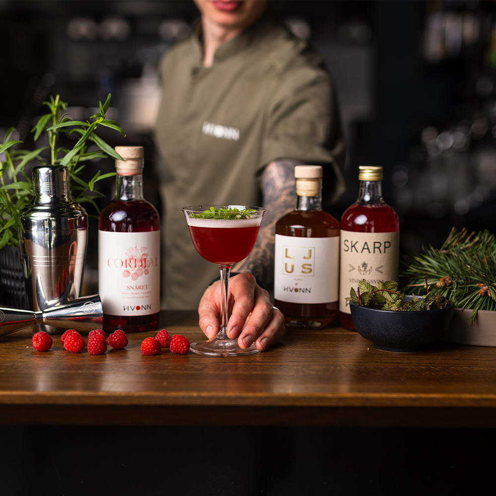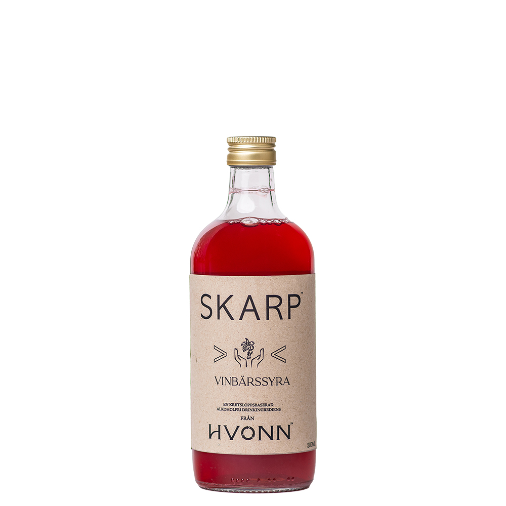 Genom att ta tillvara pressade bär från juicetillverkningen skapar vi SKARP – en serie hållbara drinkingredienser där bären återanvänds och förädlas med mjölksyra. Resultatet är koncentrerade “bärsyror” med lågt pH, likt citrusfrukter, som ger drinkar och maträtter en frisk och balanserad syra.