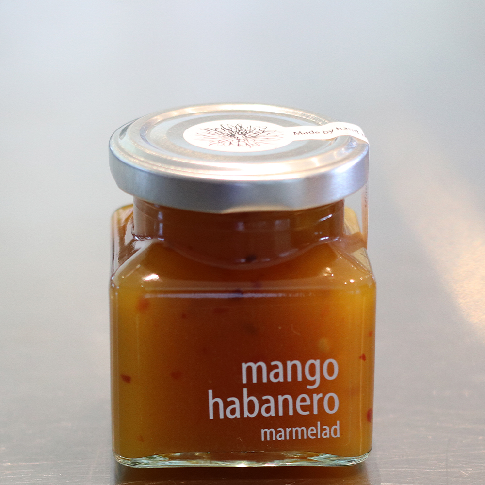 Här samsas solmogen mango med Göteborgsodlad habanerochili, bland annat Bhut Jolokia - en av världens starkaste chilisorter. Kombinationen fungerar väl ihop, och hettan matchas bra av fruktigheten.