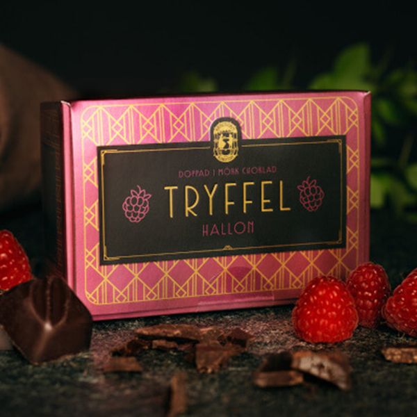 Hallontryffel doppad i mörk choklad.
