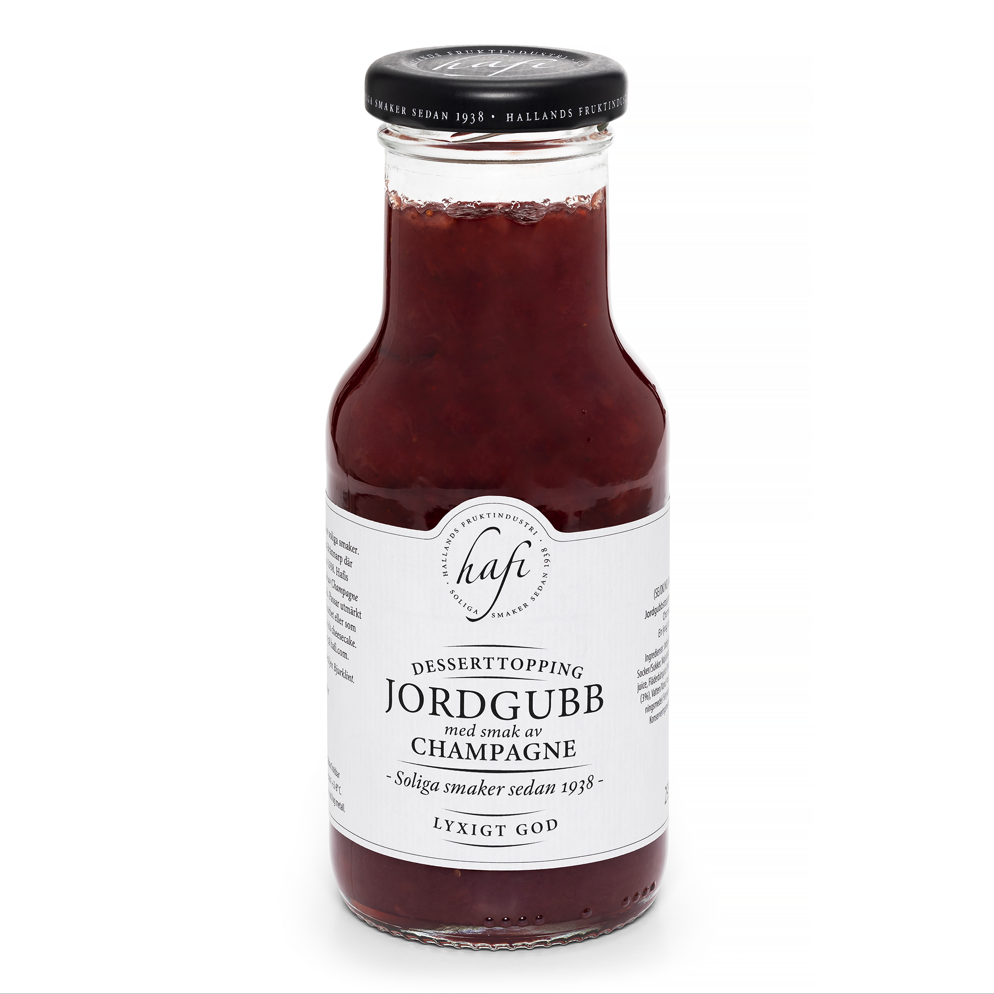 - Jordgubbar (50%), Socker, Majsstärkelse, Citronjuice, Fläderbärsjuice, Champagne (3%), Vatten, Arom, Förtjockningsmedel (pektin), Konserveringsmedel (kaliumsorbat).