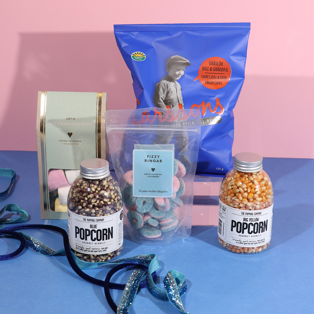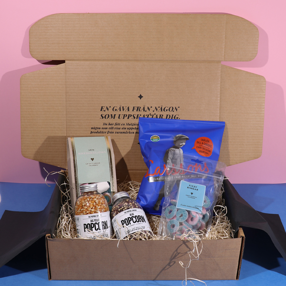 En naggande god matgåva för den som gillar chips, pocorn och färglatt godis med en sur touch.